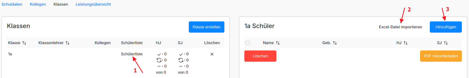 Um Schüler zu jeder Klasse hinzuzufügen, gehen Sie folgendermaßen vor: Klicken Sie in der Klassenliste auf „Schülerliste“ (1) neben dem Namen der Klasse. Im erscheinenden Fenster können Sie entweder auf „Hinzufügen“ (3) klicken, um einen einzelnen Schüler hinzuzufügen, oder auf „Excel-Datei importieren“ (2), um die gesamte Schülerliste der Klasse hochzuladen.
