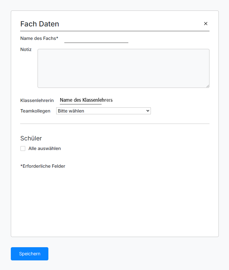 Im erscheinenden Fenster auf der rechten Seite können Sie den Namen des Fachs eingeben, den/die Fachlehrer(in) auswählen und eine Notiz für ihn/sie hinterlassen. Wenn der Bereich „Schüler“ bereits ausgefüllt ist, können Sie auch Schüler(innen) aus der Liste auswählen, die dieses Fach besuchen werden.