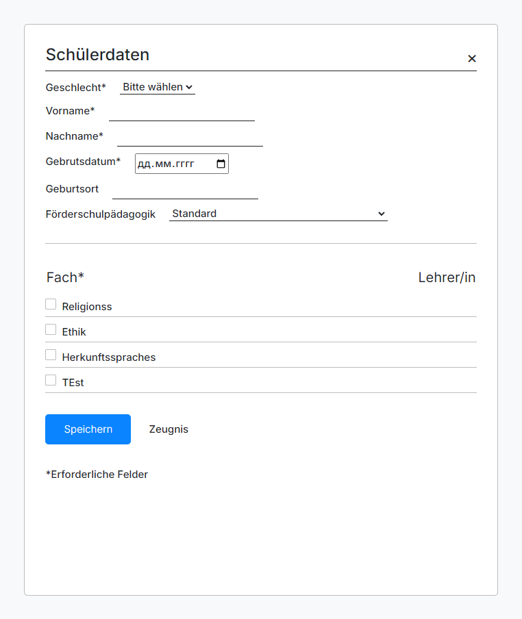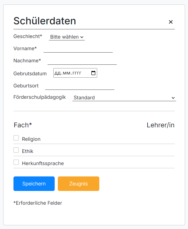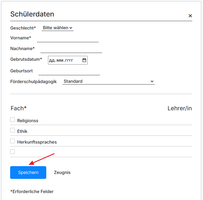 Im Bereich „Schüler“ klicken Sie auf die Schaltfläche „Hinzufügen“. Geben Sie im geöffneten Fenster rechts die Daten des Schülers ein und klicken Sie auf „Speichern“.