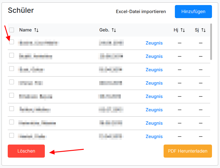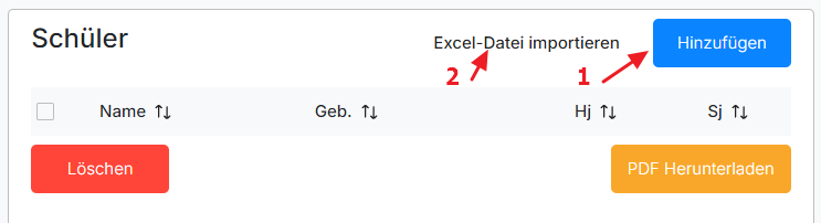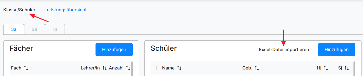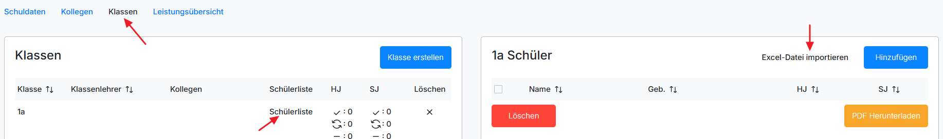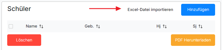 Die Liste der Schüler kann durch Klicken auf „Excel-Datei importieren“ im Bereich „Schüler“ hochgeladen werden.