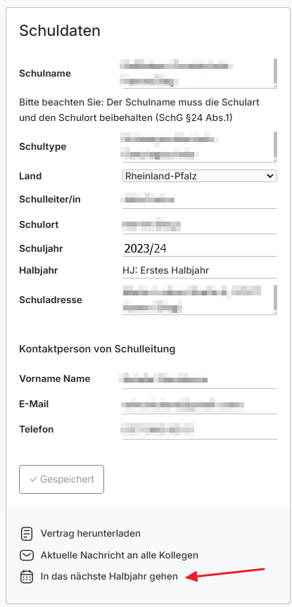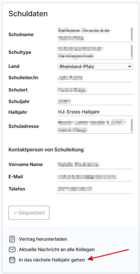 Um das Schulhalbjahr zu ändern, klicken Sie im Bereich Schuldaten auf "In das nächste Halbjahr gehen".