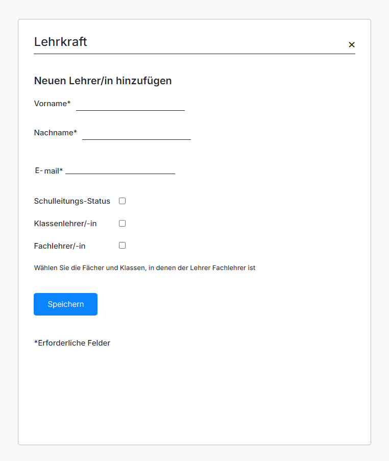 Hier können Sie den Lehrer auch als Klassenleiter oder Fachlehrer/in in einer bestimmten Klasse zuweisen. Setzen Sie dazu ein Häkchen im entsprechenden Feld, wählen Sie dann die Klasse aus (oder erstellen Sie eine neue), und im Fall von Fachlehrer/in wählen Sie das Fach und die Klassen, in denen es unterrichtet wird.