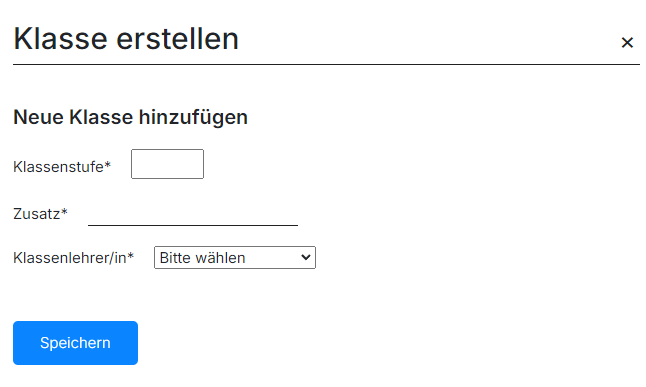 Klicken Sie dazu auf „Klasse erstellen“ und geben Sie im geöffneten Fenster die Klassenstufe und den Zusatz ein und wählen Sie den Klassenlehrer aus der Dropdown-Liste aus. Hier können nur die Lehrkräfte ausgewählt werden, die zuvor im Bereich „Kollegen“ eingetragen wurden. Falls dies noch nicht geschehen ist, kehren Sie zur Frage “Hinzufügen eines Lehrers” und geben Sie die Lehrernamen ein. Um die eingegebenen Klassendaten zu speichern, klicken Sie auf „Speichern“.