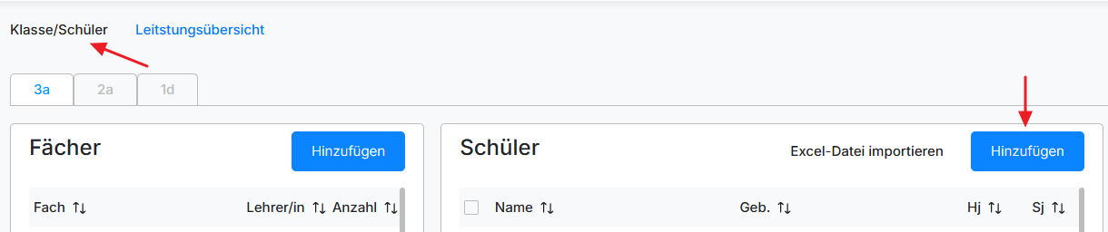 Wenn der Bereich „Schüler“ leer ist, müssen Sie die Schüler eigenständig in Ihre Klasse hinzufügen. Dies können Sie entweder tun, indem Sie auf die Schaltfläche „Hinzufügen“ (1) klicken, um einen einzelnen Schüler hinzuzufügen, oder auf „Excel-Datei importieren“ (2), um die gesamte Schülerliste der Klasse hochzuladen.