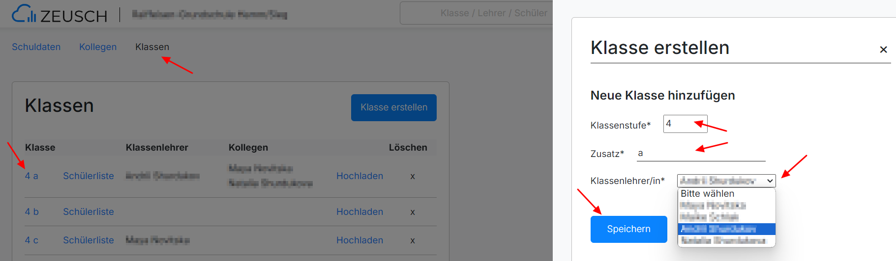 Anschließend müssen Sie in der oberen Menüleiste zum Bereich „Klassen“ wechseln. Hier können Klassen und Schüler zu diesen Klassen hinzugefügt werden. Klicken Sie dazu auf „Klasse erstellen“ und geben Sie im geöffneten Fenster die Klassenstufe und den Zusatz ein und wählen Sie den Klassenlehrer aus der Dropdown-Liste aus. Hier können nur die Lehrkräfte ausgewählt werden, die zuvor im Bereich „Kollegen“ eingetragen wurden. Falls dies noch nicht geschehen ist, kehren Sie zu Schritt 3 dieser Anleitung zurück und geben Sie die Lehrernamen ein. Um die eingegebenen Klassendaten zu speichern, klicken Sie auf „Speichern“.