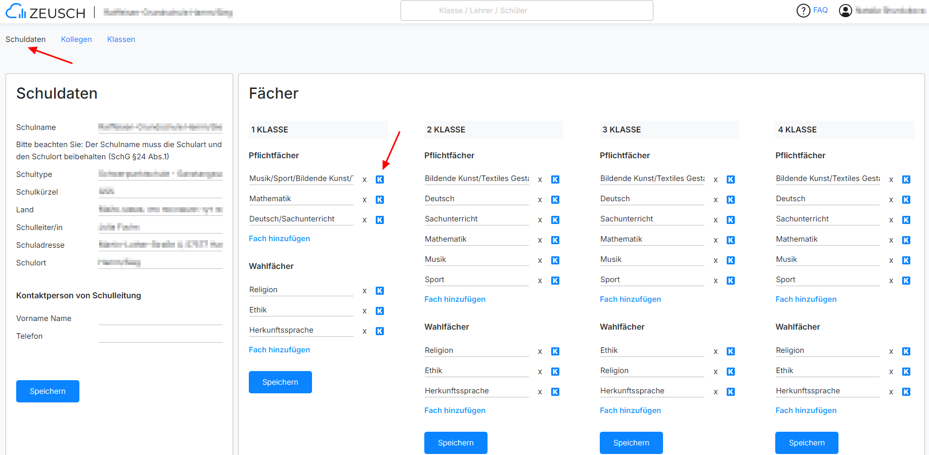 Nur Benutzer(innen) mit Schulleitungszugriff haben die Möglichkeit, Kompetenzen und Besonderheiten im Zeusch-Programm hinzuzufügen und zu ändern. Dies kann im Bereich „Schuldaten“ vorgenommen werden. Klicken Sie neben dem gewünschten Fach auf das blaue Quadrat mit dem Buchstaben „K“.