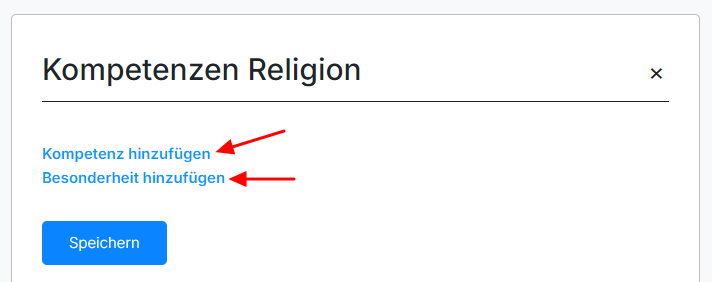 Im erscheinenden Fenster klicken Sie je nach Bedarf auf „Kompetenz hinzufügen“ oder „Besonderheit hinzufügen“.