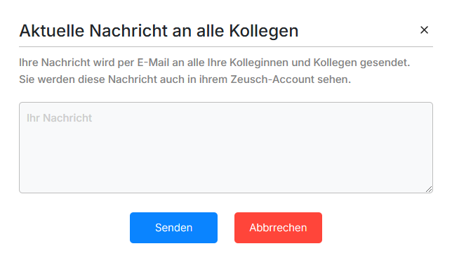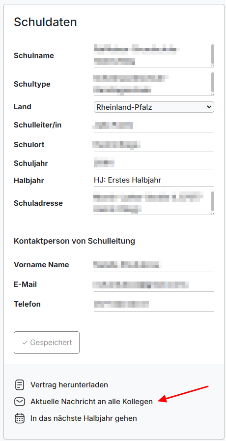 Um eine Nachricht zu senden, kann die Schulleitung im Bereich Schuldaten auf den Link "Aktuelle Nachricht an alle Kollegen" klicken. Geben Sie den Nachrichtentext im erscheinenden Fenster ein und klicken Sie auf die Schaltfläche "Senden".