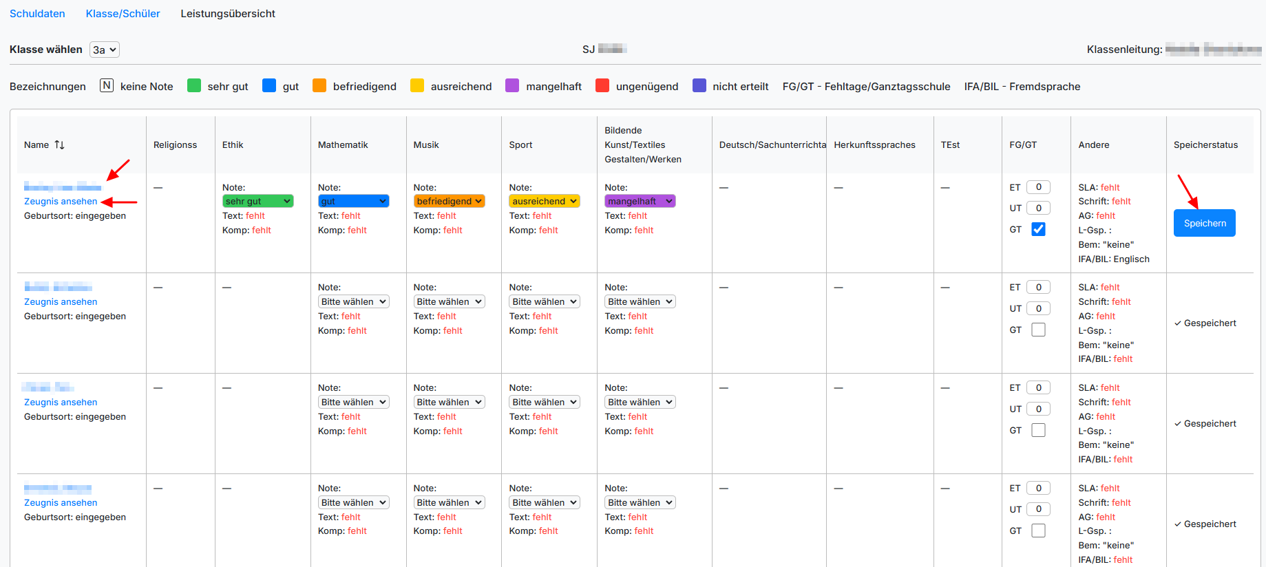 Alle Änderungen, die in der Tabelle *Leistungsübersicht* vorgenommen werden, müssen für jeden Schüler mit der Schaltfläche *Speichern* bestätigt werden, andernfalls werden die Daten nicht gespeichert.