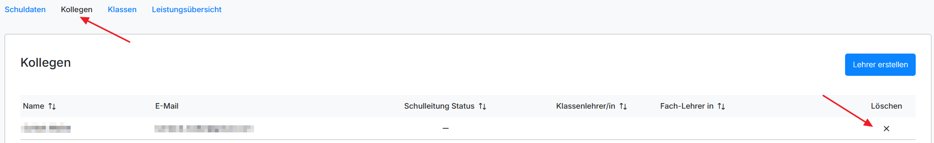 Danach wird der Lehrer oder die Lehrerin aus der Liste der Schule entfernt, und der Zugang zum Zeusch-Programm wird gesperrt. Die Lehrerdaten können nicht wiederhergestellt werden.